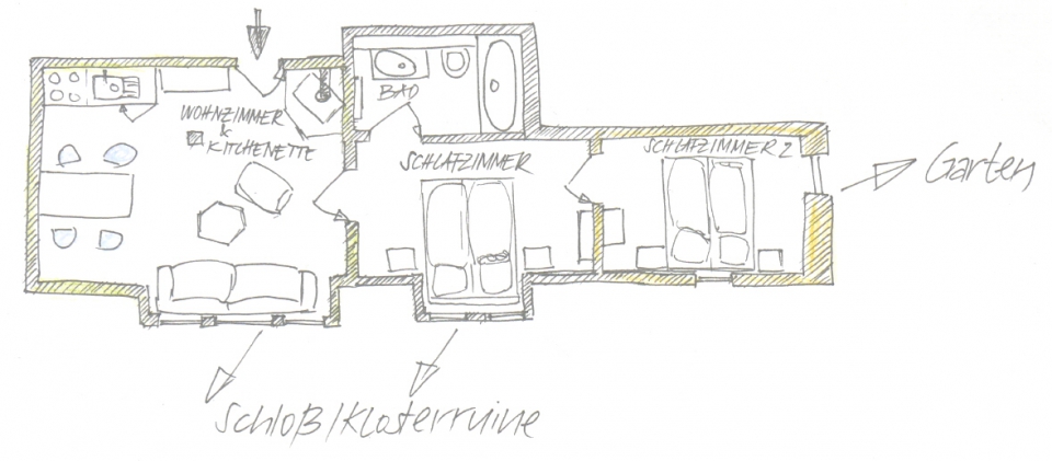Die großzügige Ferienwohnung von 52 qm mit Blick auf die Ruine der Kloster- und Schlossanlage und den Garten verfügt über zwei separate Schlafzimmer mit Doppelbetten und ist für 4 Personen (+2 Personen auf dem Bettsofa im Wohnzimmer) ausgelegt.